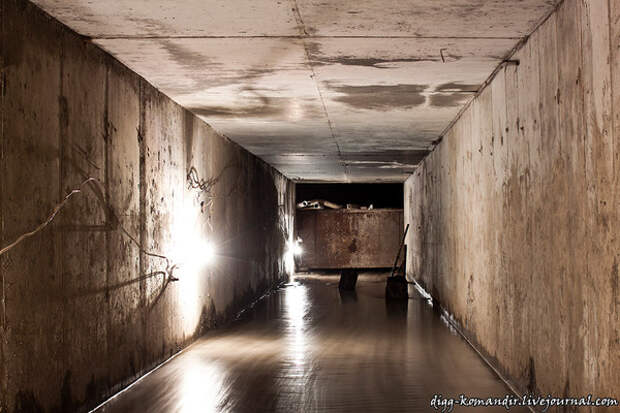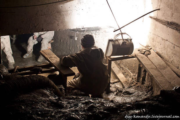 Второй, параллельный, полон грязи, вычищением которой четверо рабочих и занимались. Собранная и разжиженная грязь высасывалась большим шлангом на поверхность.